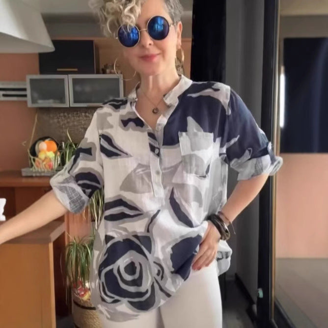 Su corte holgado junto con un estampado floral abstracto crean un look único que puedes combinar fácilmente con jeans, leggings o pantalones de lino. La mezcla de azul marino, blanco y gris le da un aire fresco y moderno.